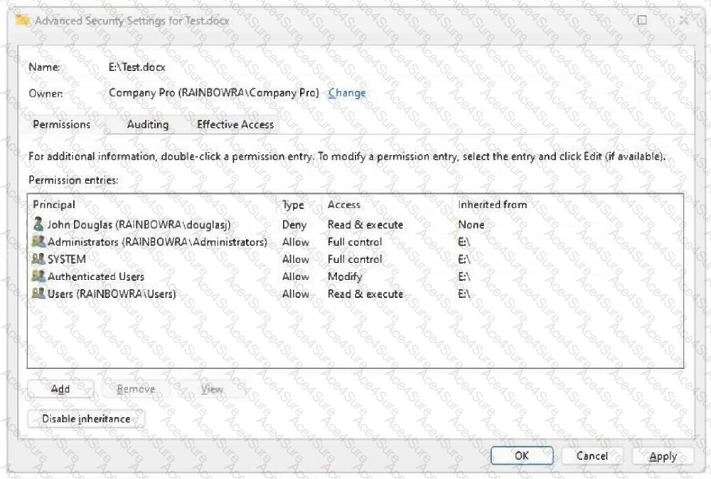 John indicates that he cannot edit the file Test.docx, which is stored on a network shared drive. John can access and edit other files on the shared drive. You review permissions for the file and see the permissions shown in the following screenshot.