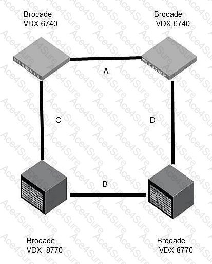 Your customer wants to take advantage of Brocade trunking to optimize the data backups over their Brocade VCS Fabric. The fabric will consist of four devices as shown in the exhibit.