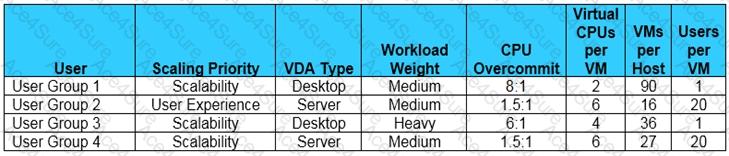 The table in the exhibit lists details about the requirements of the current user groups and their Virtual Delivery Agent (VDA) machine workloads.