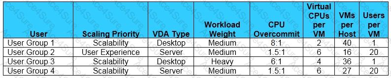 The table in the exhibit lists details about the requirements of the current user groups and their Virtual Delivery Agent (VDA) machine workloads.