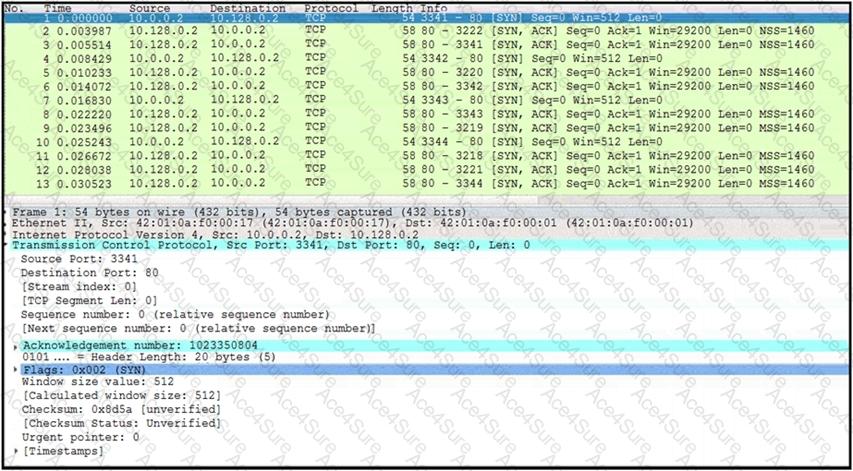 The exhibit shows a high rate of SYN packets being sent from multiple sources towards a single destination IP. This is indicative of a SYN flood attack, where the attacker sends a succession of SYN requests to a target’s system in an attempt to consume enough server resources to make the system unresponsive to legitimate traffic. References := Cisco Cybersecurity Operations Fundamentals - Module 4: Network Intrusion Analysis