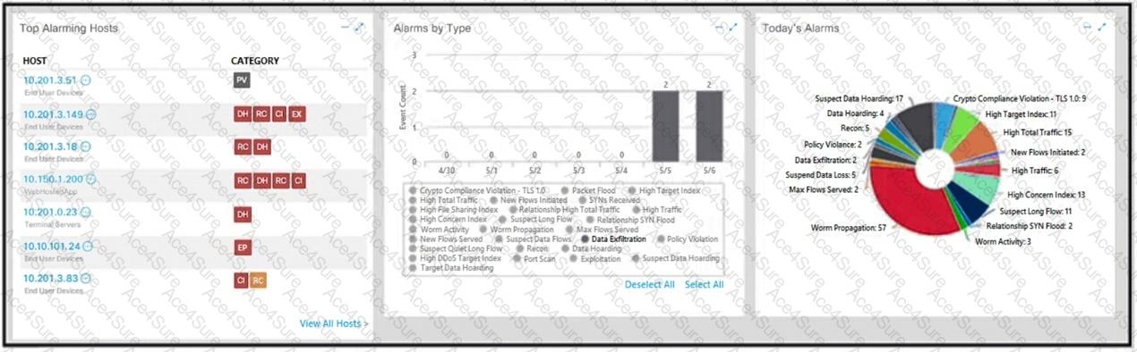 The exhibit shows a Stealthwatch dashboard displaying information on alarming hosts, alarms by type, and today’s alarms. On the left side under “Top Alarming Hosts,” there are five host IP addresses listed with their respective categories indicating different types of alerts including ‘Data Hoarding’ and ‘Exfiltration.’ In “Alarms by Type” section at center top part of image shows bar graphs representing various alarm types including ‘Crypto Violation’ with their respective counts. On right side under “Today’s Alarms,” there’s a table showing the details of each alarm such as the host IP, the alarm type, the severity, and the time. The potential threat identified in this dashboard is that there are two active data exfiltration alerts, one for host 10.201.3.149 and another for host 10.10.101.24. Data exfiltration is the unauthorized transfer of data from a compromised system to an external destination, such as a command and control server or a malicious actor. This can result in data loss, breach of confidentiality, and damage to the organization’s reputation and assets. References := Cisco Cybersecurity Operations Fundamentals - Module 7: Network and Host Forensics