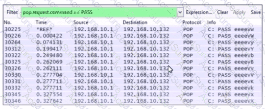 The screenshot shows multiple POP requests with the command PASS, which is typically used for password entry. The rapid succession and variation of these requests suggest an attempt to guess the password, characteristic of a brute-force attack. Remember, always verify with additional data or context when possible, as packet captures can contain vast amounts of information and may require thorough analysis for accurate interpretation.