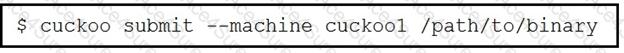 The command “$ cuckoo submit --machine cuckoo1 /path/to/binary” indicates that a binary located at “/path/to/binary” is being submitted to be run on a virtual machine named “cuckoo1”. This is a common practice in cybersecurity to analyze the behavior of suspicious files in an isolated environment. References: Cisco Cybersecurity documents or resources are needed for more detailed information.