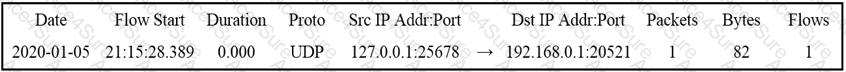 The exhibit shows a log that contains information such as the date, flow start, duration, protocol used, source and destination IP addresses and ports, packets, bytes, and flows. This type of detailed metadata is typically associated with NetFlow logs which are used for collecting IP traffic information and monitoring network traffic. References := Cisco CyberOps Associate