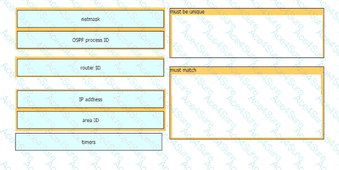 A network engineer is configuring an OSPFv2 neighbor adjacency Drag and drop the parameters from the left onto their required categories on the right. Not all parameters are used