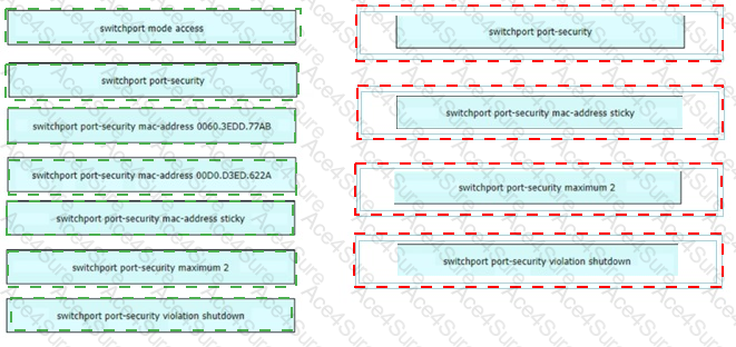 An engineer is tasked to configure a switch with port security to ensure devices that forward unicasts multicasts and broadcasts are unable to flood the port The port must be configured to permit only two random MAC addresses at a time Drag and drop the required configuration commands from the left onto the sequence on the right Not all commands are used.