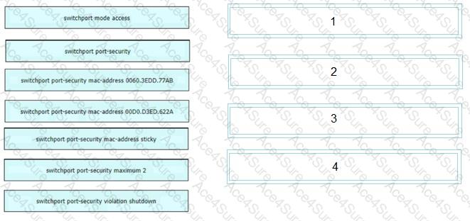 An engineer is tasked to configure a switch with port security to ensure devices that forward unicasts multicasts and broadcasts are unable to flood the port The port must be configured to permit only two random MAC addresses at a time Drag and drop the required configuration commands from the left onto the sequence on the right Not all commands are used.