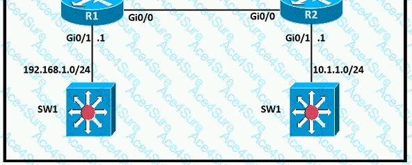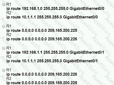A network engineer is in the process of establishing IP connectivity between two sites. Routers R1 and R2 are partially configured with IP addressing. Both routers have the ability to access devices on their respective LANs. Which command set configures the IP connectivity between devices located on both LANs in each site?