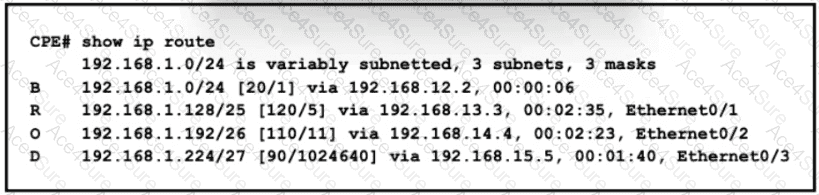 All traffic enters the CPE router from interface Serial0/3 with an IP address of 192 168 50 1 Web traffic from the WAN is destined for a LAN network where servers are load-balanced An IP packet with a destination address of the HTTP virtual IP of 192 1681 250 must be forwarded Which routing table entry does the router use?