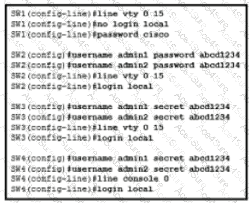 An administrator configures four switches for local authentication using passwords that are stored in a cryptographic hash. The four switches must also support SSH access for administrators to manage the network infrastructure. Which switch is configured correctly to meet these requirements?