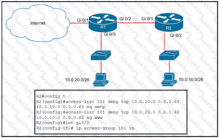 An extended ACL has been configured and applied to router R2 The configuration failed to work as intended Which two