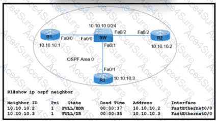 Refer to the exhibit. R1 has taken the DROTHER role in the OSPF DR/BDR election process. Which configuration must an engineer implement so that R1 is elected as the DR?