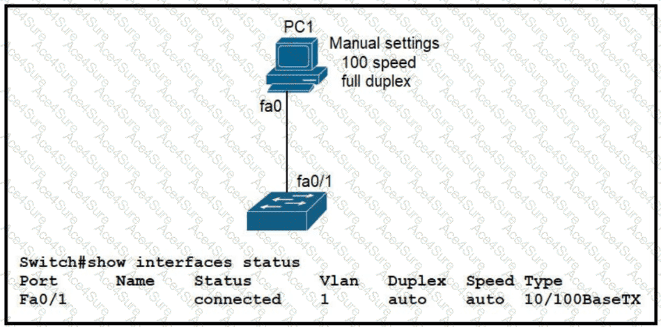 The link between PC1 and the switch is up. but it is performing poorly. Which interface condition is causing the performance problem?
