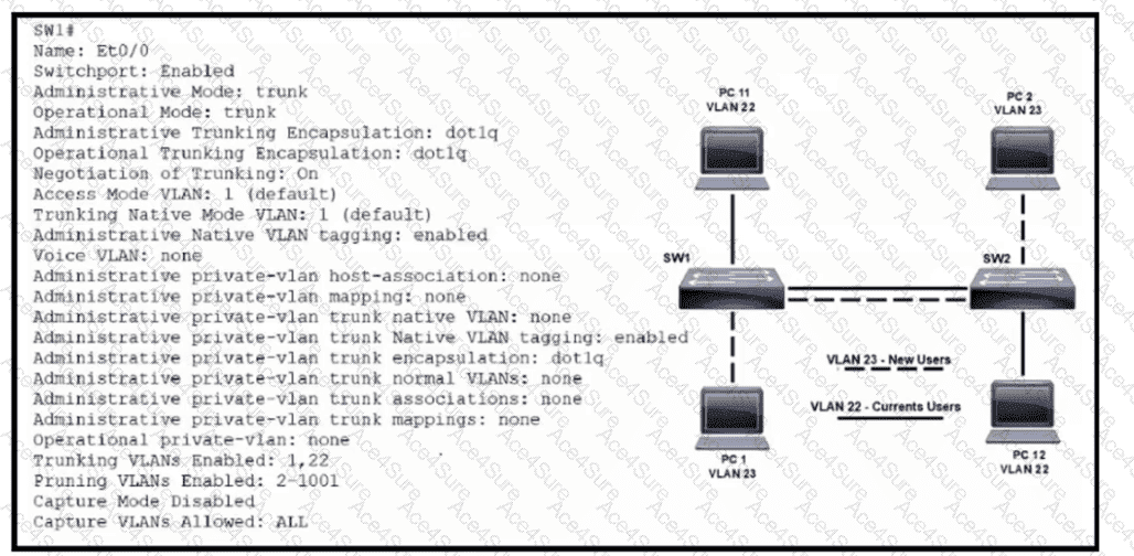 Refer to the exhibit. VLAN 23 is being implemented between SW1 and SW2. The command show interface ethernet0/0 switchport has been issued on SW1. Ethernet0/0 on SW1 is the uplink to SW2. Which command when entered on the uplink interface allows PC 1 and PC 2 to communicate without impact to the communication between PC 11 and PC 12?