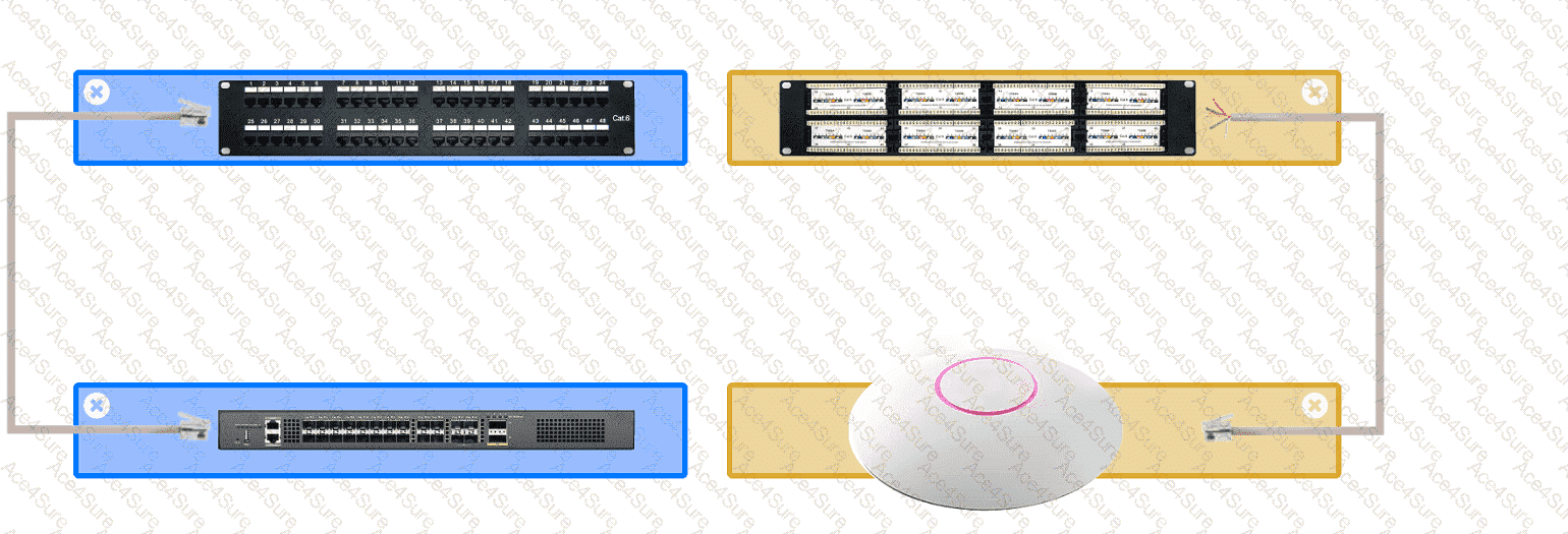 An access point was moved and no longer has connectivity. Connect the access point, patch panel, and switch by clicking the (+) to select the appropriate cable end for each corresponding location to create a link.