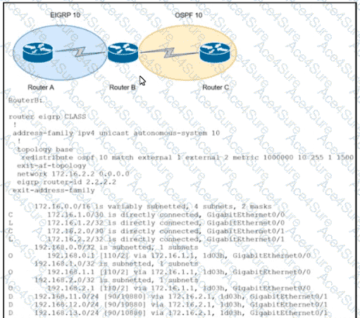 Refer to the exhibit. An engineer configured route exchange between two different companies for a migration project EIGRP routes were learned in router C but no OSPF routes were learned in router A. Which configuration allows router A to receive OSPF routes?