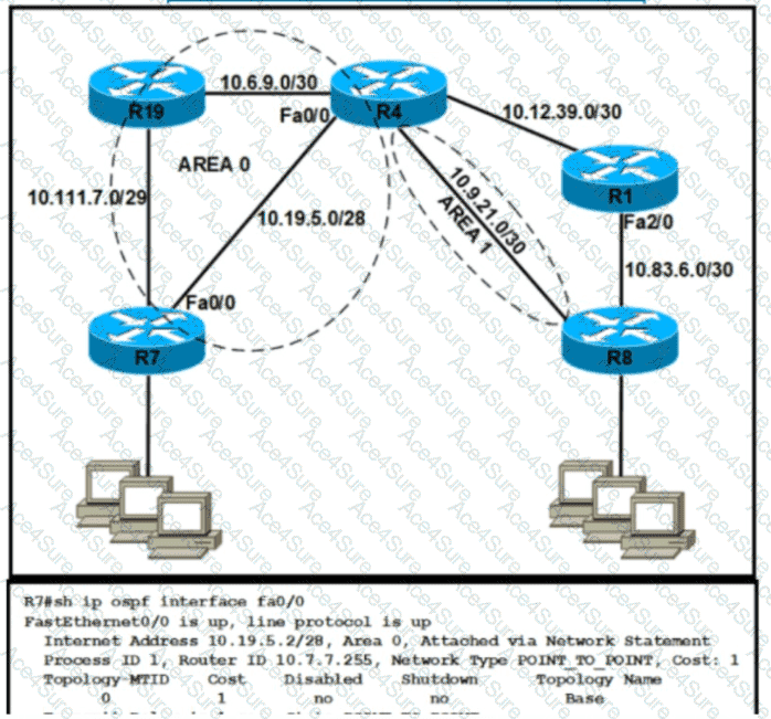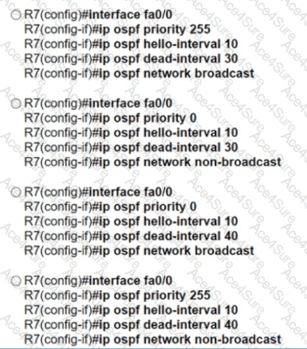 Refer to the exhibit. Router R4 is configured correctly with default OSPF values. A network engineer configured R7 for OSPF. R7 must not be elected as a DR for the segment between R4-R7. The adjacency between R4 and R7 failed to form. Which configuration resolves the issue?