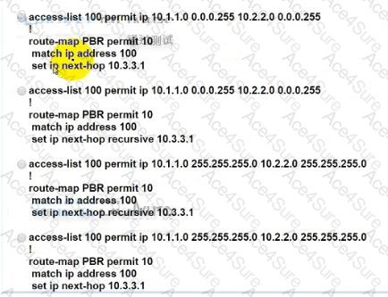 An engineer must configure PBR on R1 to reach to 10.2.2.0/24 via R3 AS64513 as the primary path and a backup route through default route via R2 AS64513. All BGP routes are in the routing table of R1. but a static default route overrides BGP routes. Which PBR configuration achieves the objective?