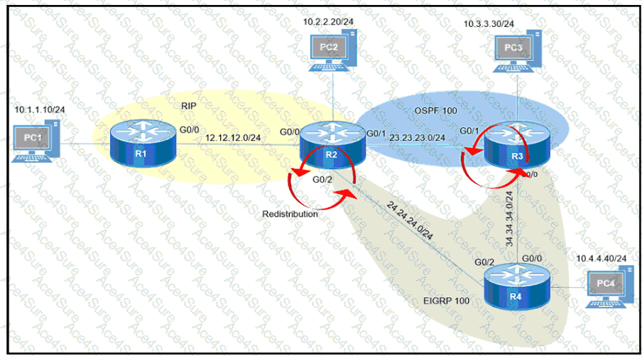 Redistribution is enabled between the routing protocols, and nowPC2 PC3, and PC4 cannot reach PC1. What are the two solutions to fix the problem? (Choose two.)