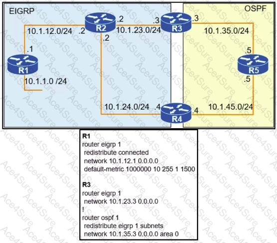 To provide reachability to network 10.1.1.0 /24 from R5, the network administrator redistributes EIGRP into OSPF on R3 but notices that R4 is now taking a ........... path through R5 to reach 10.1.1.0/24 network. Which action fixes the issue while keeping the reachability from R5 to 10.1.1.0/24 network?