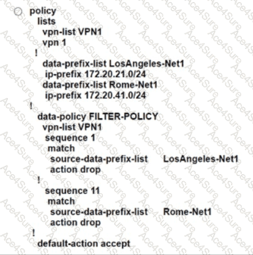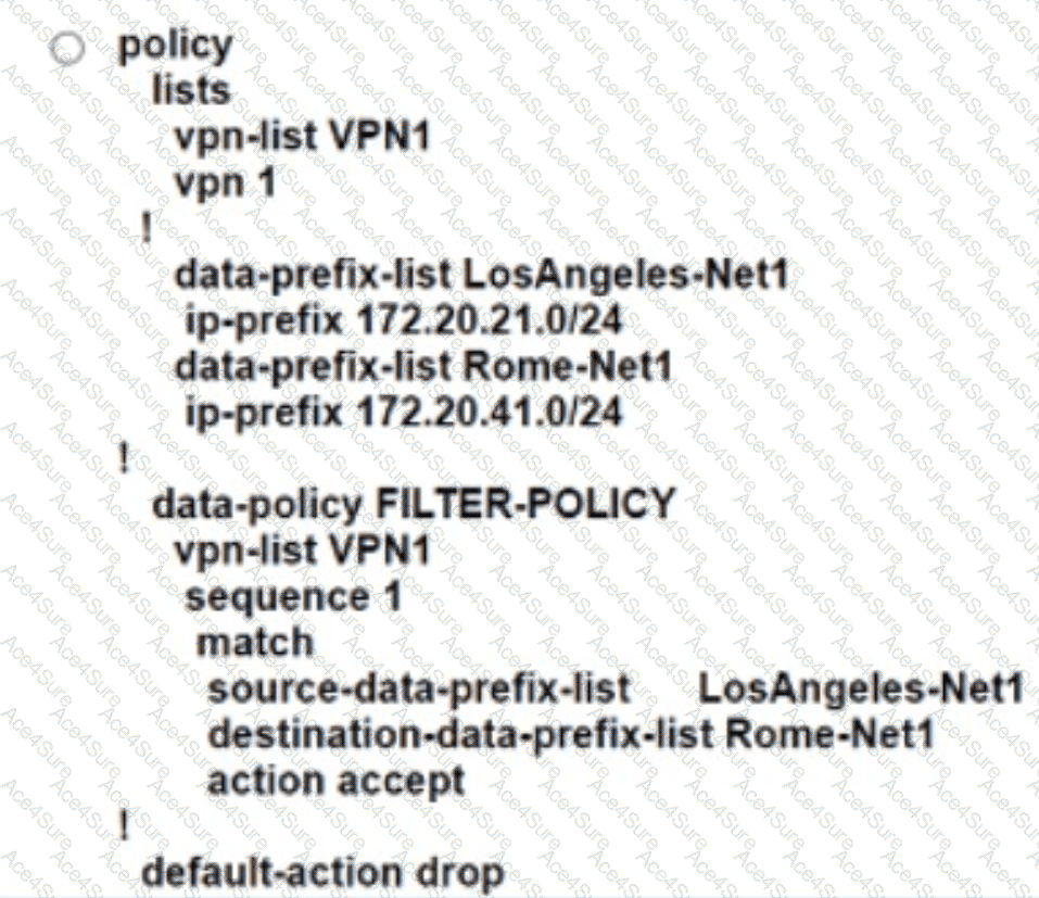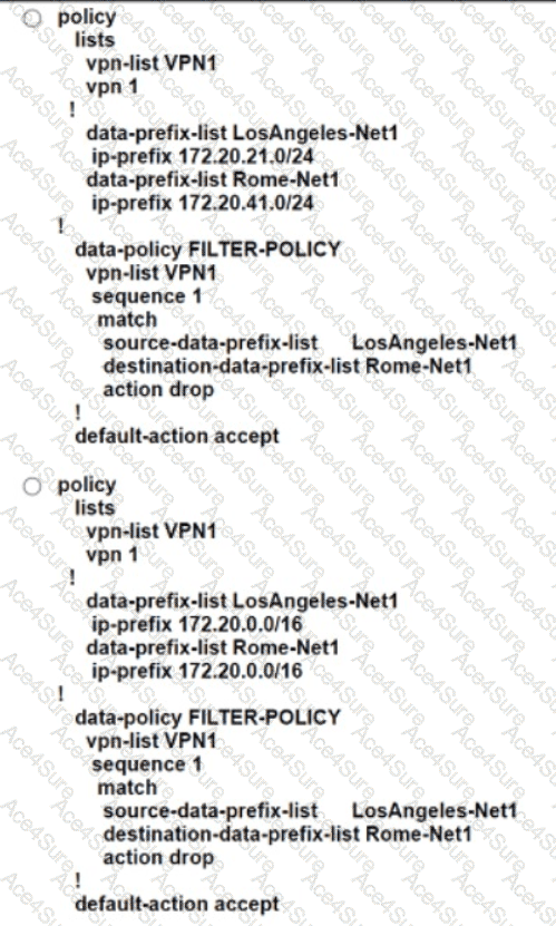 An engineer creates a data policy to prevent communication from the 172.20.21.0/24 network to the 172.20.41.0/24 network. Which configuration accomplishes this task?