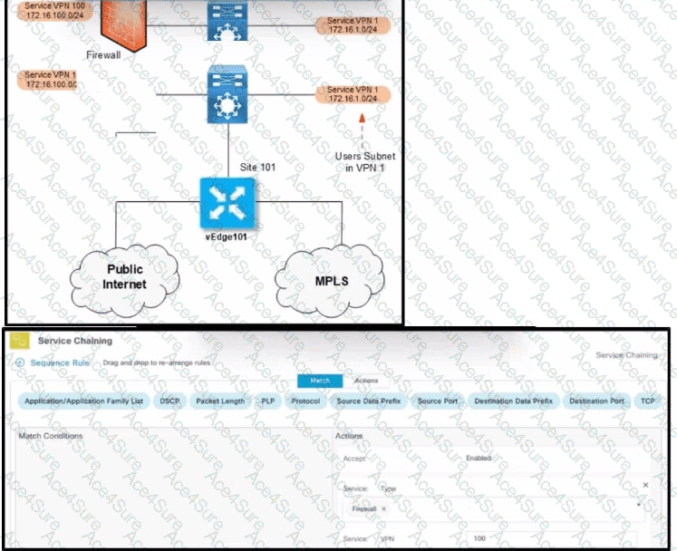 An engineer is creating a policy for VPN1 users. Their scavenger traffic at site 101 must pass through a firewall. Which two match conditions must be selected to enable this policy? (Choose two.)