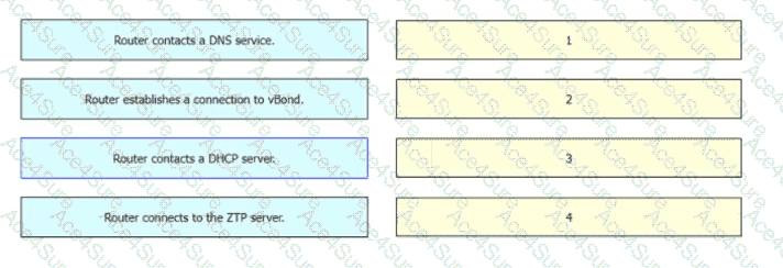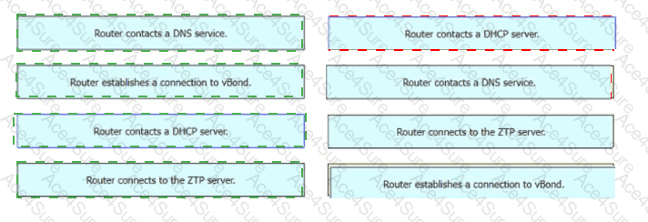 Drag and drop the steps from the left into the sequence on the right for a WAN Edge router after powering on for zero touch provisioning.