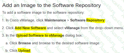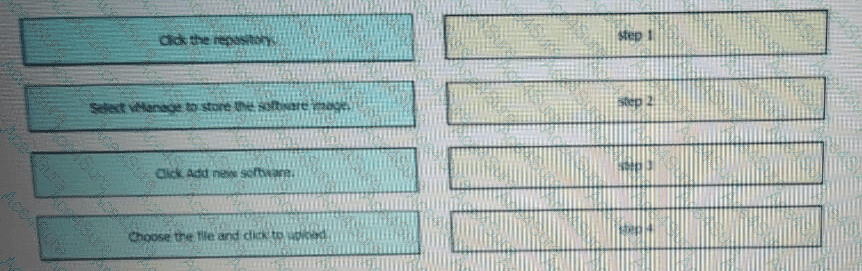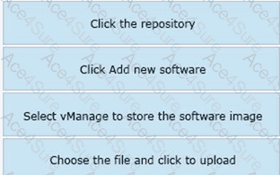 Drag and drop the steps from the left into the order on the right to upload software on vManage repository that is accessible from maintenance > Software Repository.