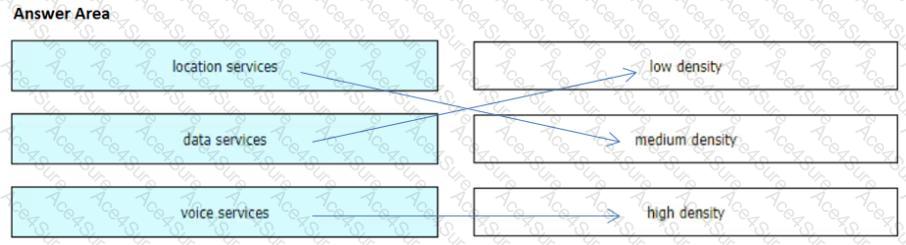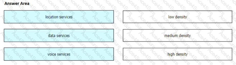A wireless consultant is creating a wireless design for a multistory building. The building will house several groups that will use the wireless network for different operations. Depending on how the wireless network is used, different wireless approach designs must be taken. Drag and drop the services from the left onto the AP density levels on the right based on the wireless deployment requirements.