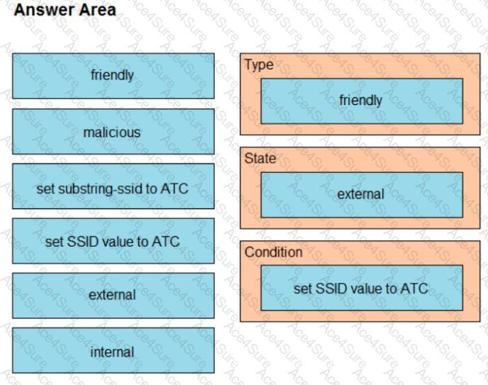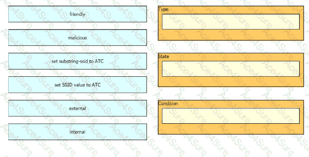 The network management team in a large shopping center has detected numerous rogue APs from local coffee shops that are broadcasting SSIDs. All of these SSIDs have names starting with ATC (for example, ATC302, ATC011, and ATC566). A wireless network engineer must appropriately classify these SSIDs using the Rogue Rules feature. Drag and drop the options from the left onto the categories in which they must be used on the right. Not all options are used.