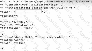 According to the ENNA architecture guidelines, the ThousandEyesStreaming APIallows users to push granular test metrics (such as network latency, packet loss, and jitter) to external collectors in an OTel-compatible format. In the provided JSON payload, the "type" field is a mandatory parameter that defines the integration protocol. For Grafana, which natively supports OpenTelemetry Protocol (OTLP) via its OpenTelemetry Collector, the value must be set to"opentelemetry"(Option A). This tells the ThousandEyes streaming engine to encapsulate the data according to the OTel semantic conventions, ensuring that Grafana can correctly interpret and visualize the metrics without additional custom parsing logic.