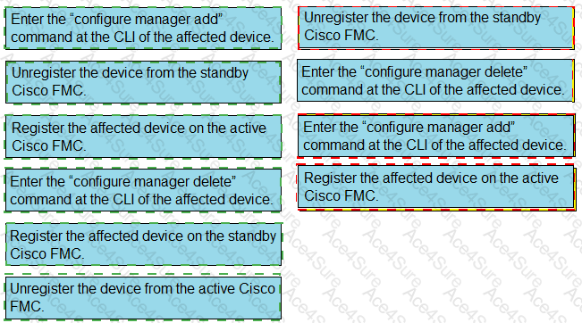 Drag and drop the steps to restore an automatic device registration failure on the standby Cisco FMC from the left into the correct order on the right. Not all options are used.
