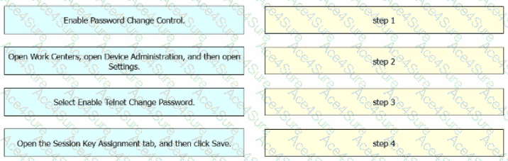 An engineer must configure Cisco ISE to be used as the TACACS+ server for any administrator that signs into the router. Users must be able to change their Telnet password through the TACACS+ server. Drag and drop the configuration steps from the left into the sequence on the right.