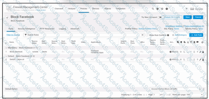 Refer to the exhibit. An engineer must block internal users from accessing Facebook and Facebook Apps. All other access must be allowed. The indicated policy was created in Cisco Secure Firewall Management Center and deployed to the internet edge firewall; however, users still can access Facebook. Which two actions must be taken to meet the requirement? (Choose two.)