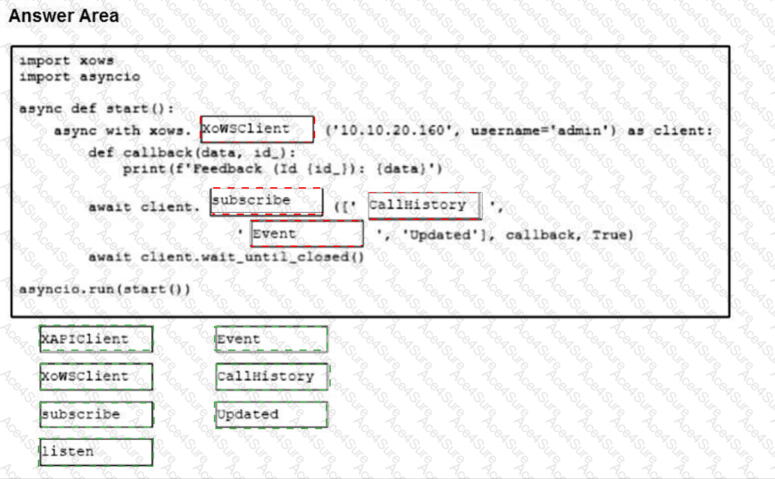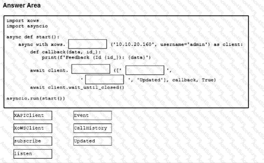 Drag and drop the code snippets from the bottom onto the boxes where the code is missing to listen for Call History events using the xAPI Python SDK.