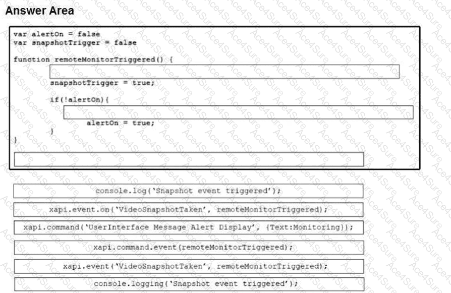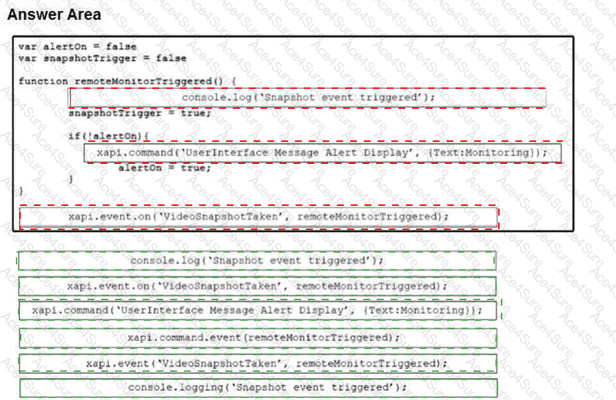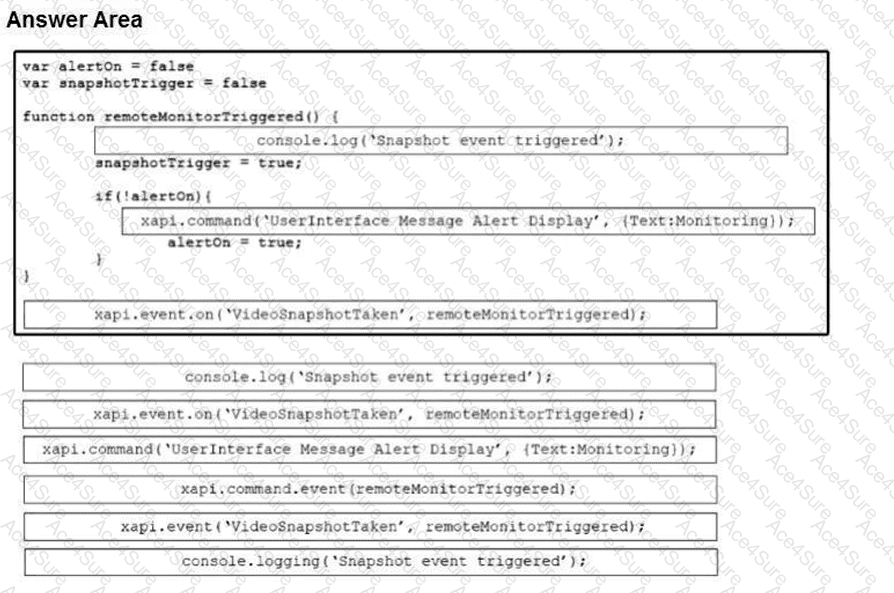 Drag and drop the code snippets from the bottom onto the blanks in the code to implement notifications on a room device. Not all options are used.