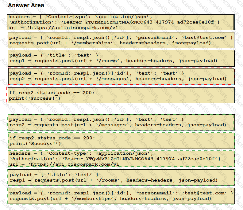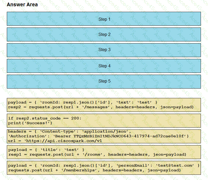 Drag and drop the code snippets into the correct order to create a Python Webex Teams REST API script that performs this sequence of tasks: create a Space, add a user to the Space, post the word “test” in the Space. Assume that the Python “requests” module has already been imported.