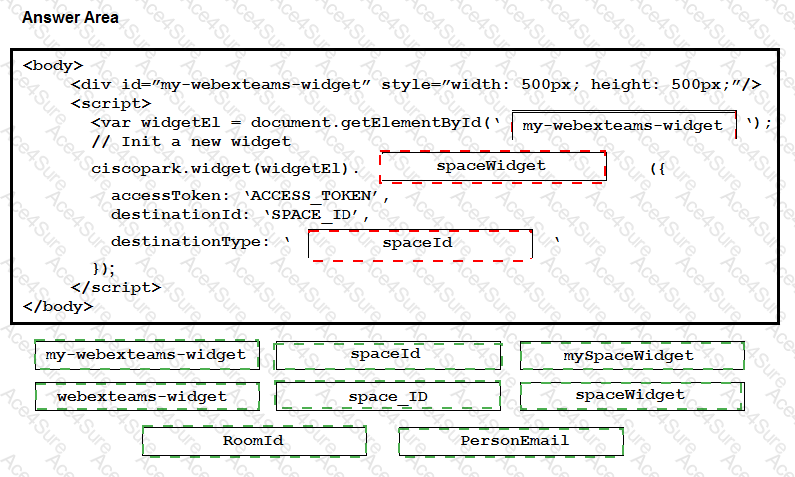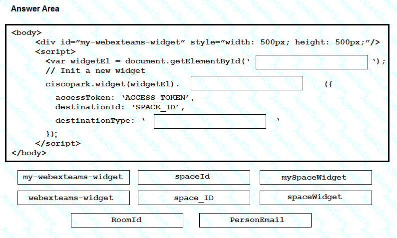 Drag and drop the code to add a Webex Teams Space Widget in an existing HTML page. Not all items are used.