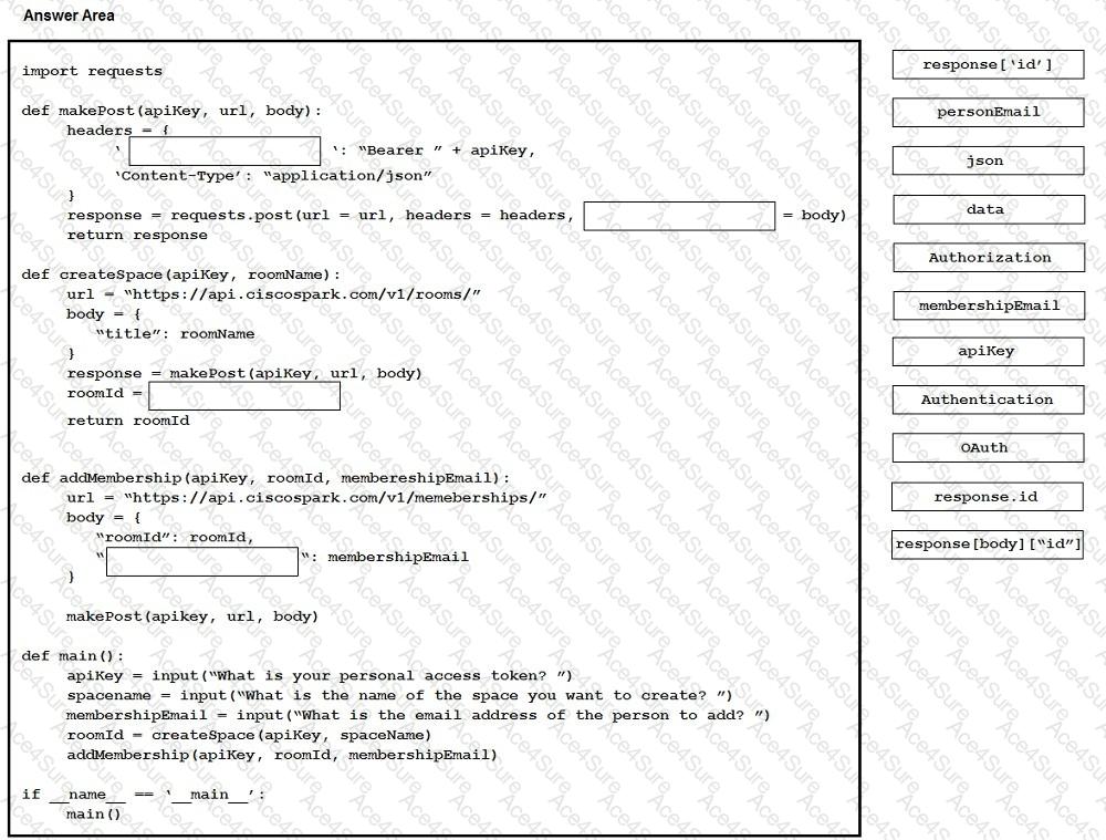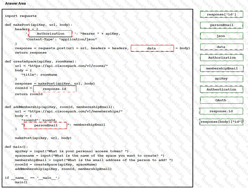 Drag and drop the correct items from the right to complete this Python script to automate the creation of Cisco Webex Teams spaces and memberships. Not all options are used.