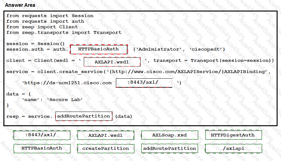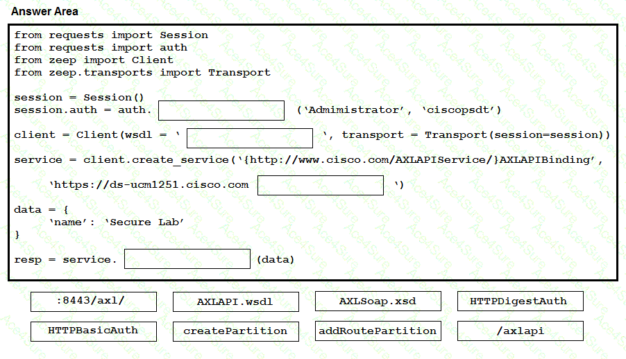 Drag drop the code to create a valid AXL API script to create a new Route Partition, using the Python Zeep library. Not all options are used.