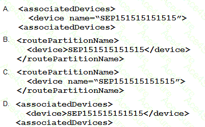 The exhibit shows the XML schema to associate a device for the AddUser operation in AXL. Which XML snippet is correct to associate a device with name “SEP151515151515”?