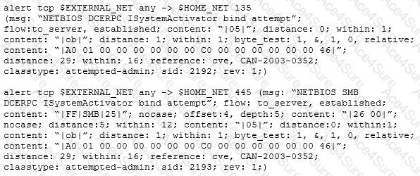 The Snort rule in the image is detecting suspicious bind attempts over DCERPC (Distributed Computing Environment/Remote Procedure Call), specifically targeting ports 135 (RPC) and 445 (SMB) with crafted content. The rule references CVE CAN-2003-0352.