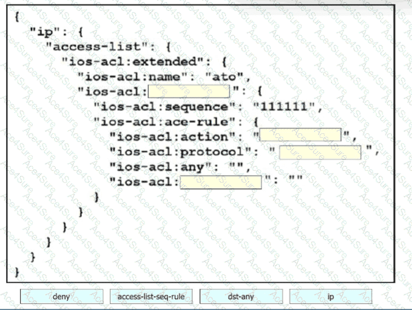 Drag and drop the code snippets from the bottom onto the blanks in the code to construct a request that configures a deny rule on an access list?