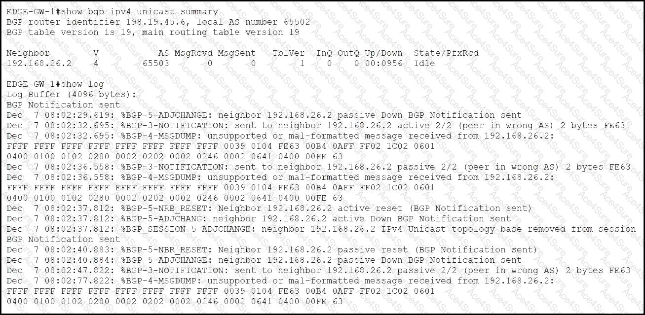 Refer to the exhibit. A network support engineer for ASN 65502 receives a technical support ticket from a customer in ASN 65503 who reports that an eBGP session is down. The engineer determines that the peering failed after a recent change to the device at 192.168.26.2. EDGE-GW-1 must establish an eBGP session with the peering router 192.168.26.2. Which configuration establishes this session?
