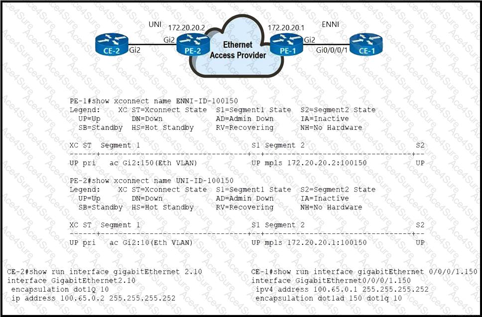 Refer to the exhibit. An Ethernet access provider is configuring routers PE-1 and PE-2 to provide E-Access EVPL service between UNI and ENNI. ENNI service multiplexing is based on 802.1ad tag 150, and service-multiplexed UNI is based on 802.1q tag 10. Which EFP configurations must the provider implement on PE-1 and PE-2 to establish end-to-end connectivity between CE-1 and CE-2?
