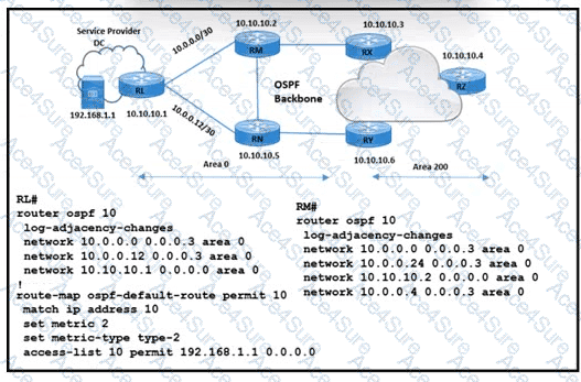Refer to the exhibit. The operations team for a service provider network is implementing a route map policy. OSPF area 0 should originate the default route with a type 2 metric of 2 when the application server on the connected interface (192.168.1.1) is up. Routers RL and RM have set up OSPF peering with other adjacent routers. Which action meets this requirement?