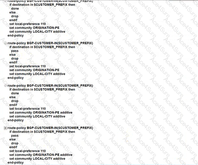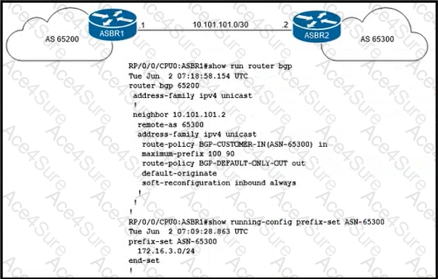 A network engineer is implementing a standard customer route-policy on ASBR1 with these requirements: