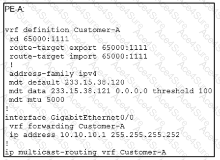 An engineer is implementing Auto-RP and reviewing the configuration of the PE-A. Which configuration permits Auto-RP messages to be forwarded over this interface?