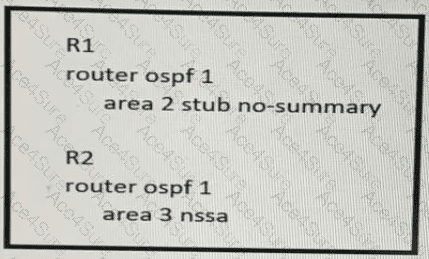 Router R1 is configured as a stub area with the “no-summary” option, which means it will not receive summary LSAs (Type 3) from the Area Border Router (ABR). It will only have Type 1 (Router LSAs) and Type 2 (Network LSAs) in its OSPF database for the area it belongs to. Router R2 is configured as an NSSA (Not So Stubby Area), which allows it to import AS external routes as Type-7 LSAs. These Type-7 LSAs can then be converted to Type-5 LSAs by the ABR when propagated into other areas. Therefore, R2 has Types 1, 2, and 7 LSAs in its OSPF database.